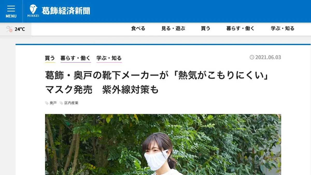 葛飾区周辺のビジネス&カルチャーニュースをお届けするインターネットの情報配信サービス「葛飾経済新聞」に、弊社の紫外線対策マスク「そよ風マスク 涼し~の(すずし~の)」をご紹介いただきました。