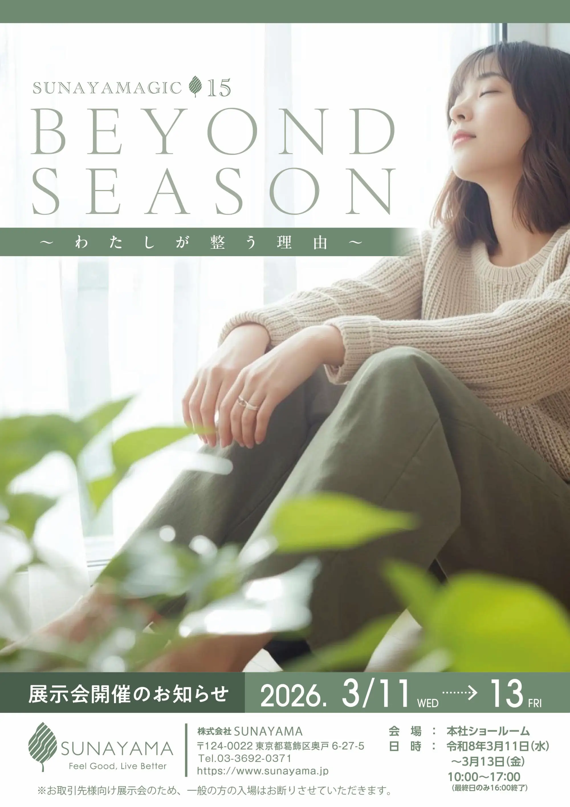 今回は、「BEYOND SEASON 〜わたしが整う理由〜」と題しまして、新商品・既存品を新たな切り口でご提案致します。ご参加お待ちしております。 今回の催しも人数を限った完全予約制での開催となります。ご来場の際は弊社担当営業までご連絡いただき、日時をご予約の上ご来場ください。
